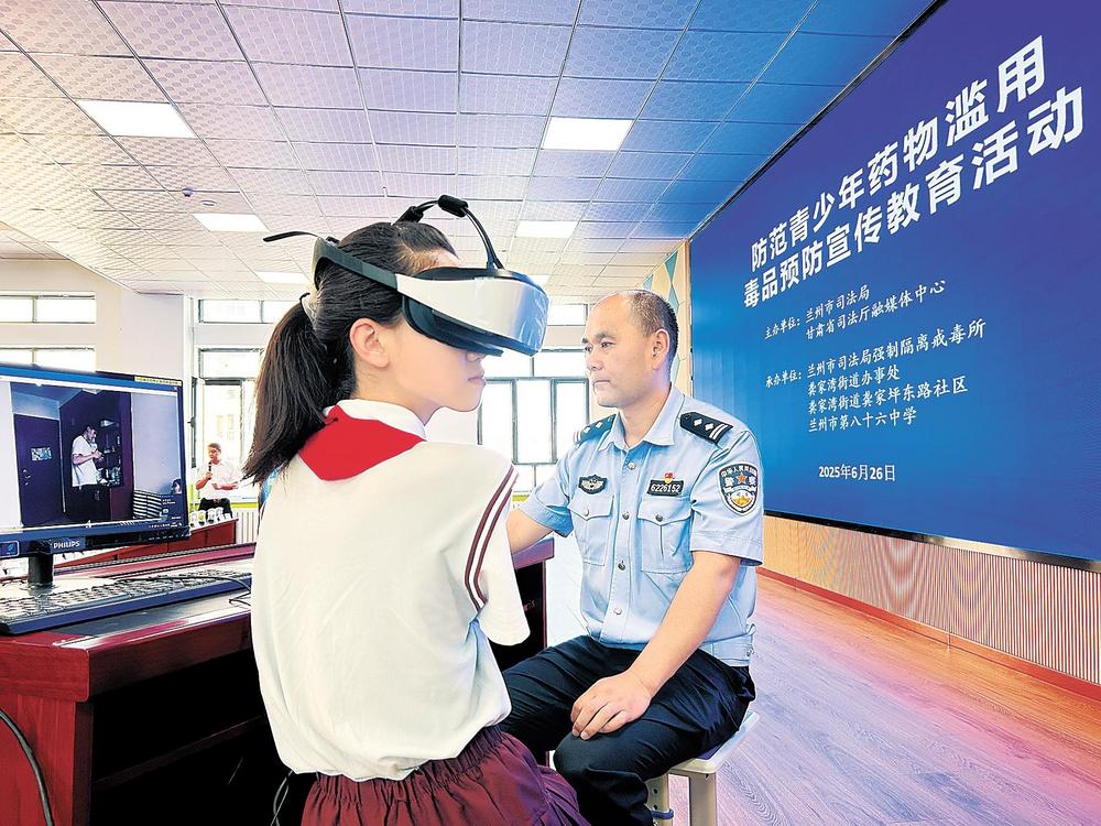 2025年6月26日,蘭州市司法局強(qiáng)制隔離戒毒所干警走進(jìn)蘭州市第八十六中學(xué)開展禁毒宣傳教育。圖為學(xué)生佩戴VR眼鏡,通過虛擬現(xiàn)實技術(shù)創(chuàng)造逼真的沾染毒品場景,讓學(xué)生身臨其境地感受毒品的危害。