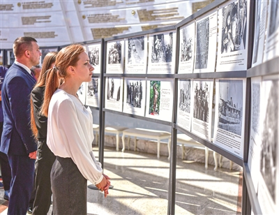 定格共同的勝利,重溫跨越時空的二戰(zhàn)記憶。“銘記歷史 開創(chuàng)未來”——紀(jì)念中國人民抗日戰(zhàn)爭暨世界反法西斯戰(zhàn)爭勝利80周年圖片展正在白俄羅斯國立偉大衛(wèi)國戰(zhàn)爭歷史博物館展出。圖為觀眾在參觀展覽。新華社記者 張超群 攝