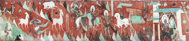 這幅壁畫(huà)在藝術(shù)風(fēng)格上獨(dú)樹(shù)一幟,深受中原繪畫(huà)形式的影響。它既摒棄了印度壁畫(huà)的環(huán)形構(gòu)圖方式,又不同于龜茲壁畫(huà)里的菱形畫(huà)面布局,而是開(kāi)創(chuàng)性地采用了連環(huán)畫(huà)式的長(zhǎng)卷式構(gòu)圖,宛如一條歷史的長(zhǎng)河,將故事娓娓道來(lái)。